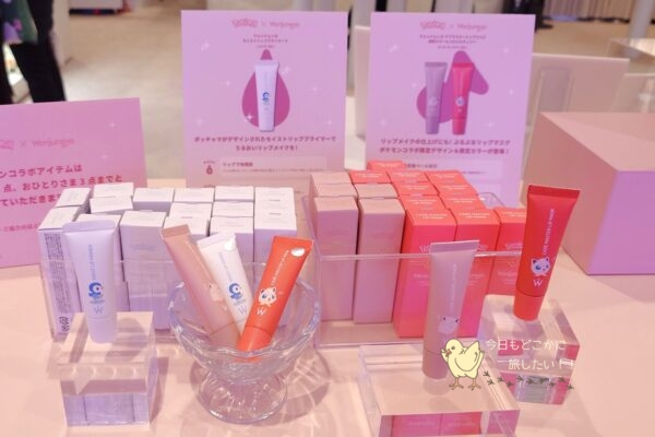 左から、リッププライマー(ポッチャマ)、ケアマスターリップ・メロメロチェリー(濃いピンクのプリン)、ケアマスターリップ・通常カラー(薄いピンクのプリン)。