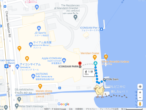 それほど遠くないですが、船着き場からアイコンサイアムの入り口まで、100mほどあります。