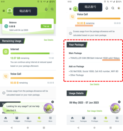 このアプリで発覚したのですが、購入時はデータ通信3GB・通話100バーツ分・7日間利用という触れ込みでしたが、実際にはデータ通信15GB・通話50バーツ分・16日間使えるというSIMでした。