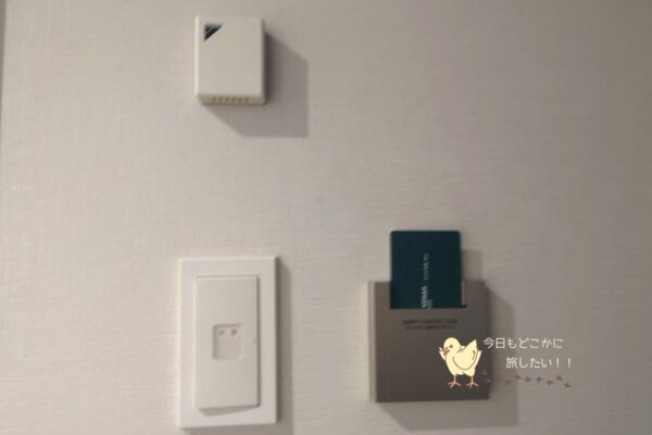 ドアを開けて、部屋入り口の差し込み口にさすと、部屋内の電気がつきます。