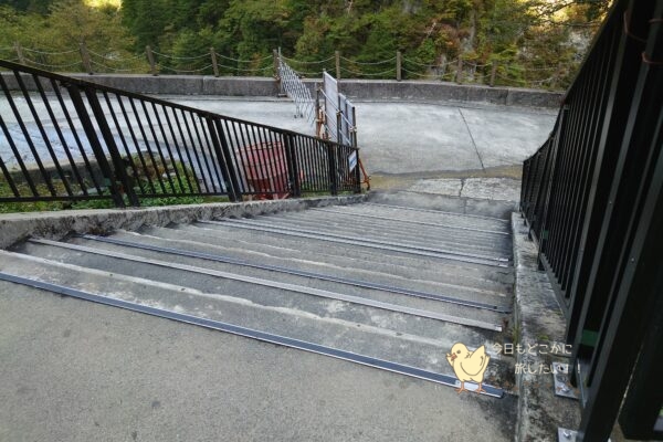 欅平駅の散策ルートは、2023時点だと階段ルートのみで、車いすやベビーカーのままだと散策が難しいです。