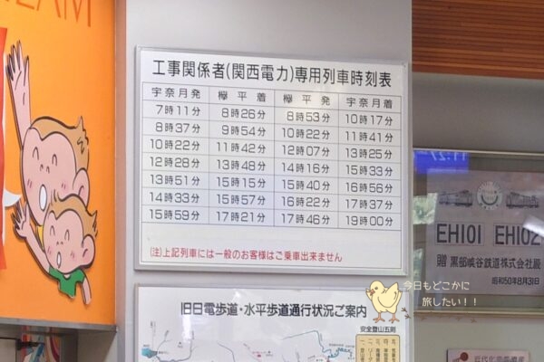 工事関係者向けの電車の時刻表は、Webサイトには載っていないですが、宇奈月駅に掲示されていました。