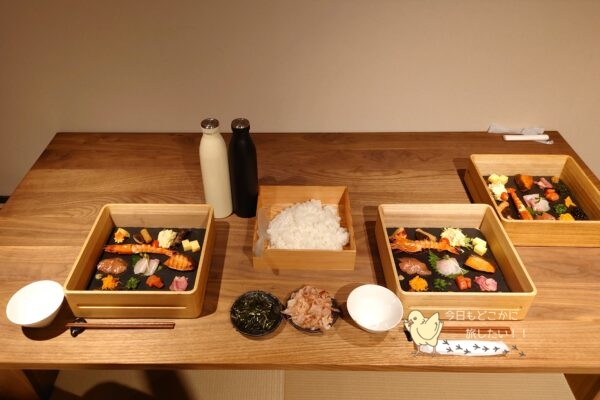 最初は出汁をかけず、ご飯とトッピングをおかずのようにして定食風にして、その後お茶漬けにしていただきました。