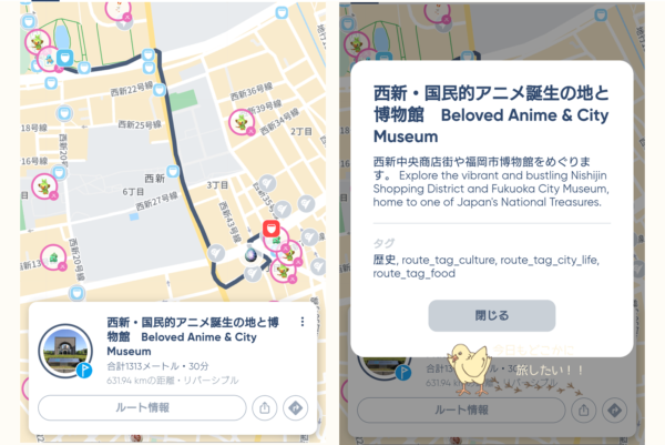 「西新・国民的アニメ誕生の地と博物館」ルートは、地下鉄空港線の西新駅から福岡市博物館までのルート。