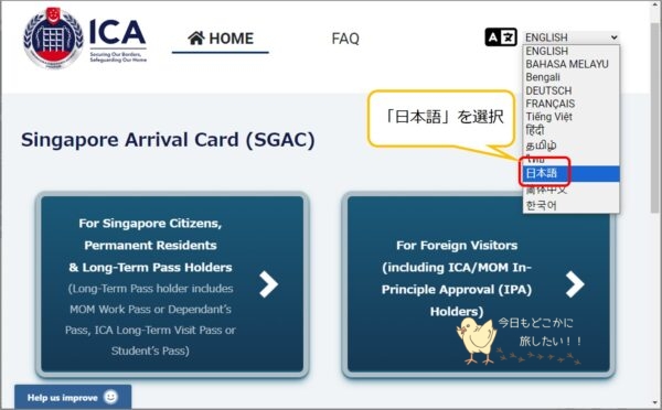 SGアライバルカードのWebサイトが開いたら、まず「日本語」に切り替えます。
