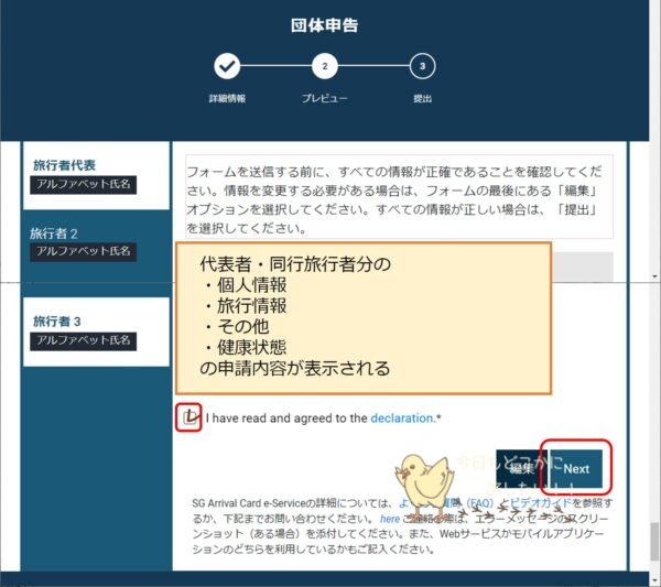 団体申告の場合は、申請した旅行者分の情報がずらっと出てくるので、内容誤りないか確認します。