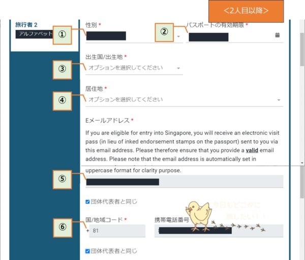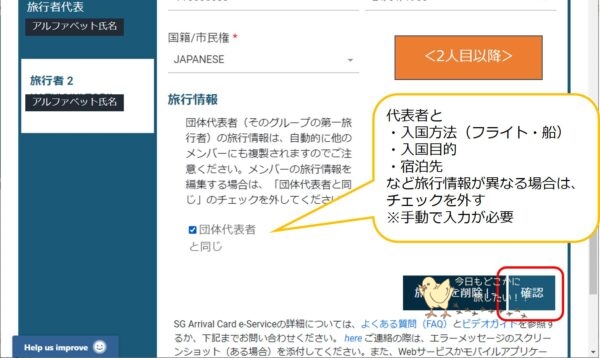 団体申告の場合は、2人目以降の情報を入力していくので、[旅行者を追加]ボタンを押して次に進みます。