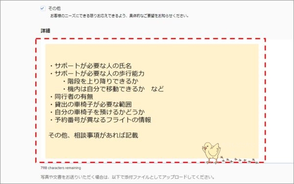これだけだと、必要なサポートが分からないので、詳細欄に記載していきます