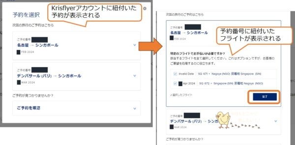 [ログイン]ボタンで、KrisFlyerでログインすると、予約しているフライトが予約番号ごとに表示されます。