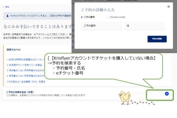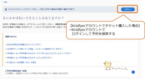 KrisFlyer会員でログインしていなかったり、購入時ログインしていたか分からない場合は、「予約番号」や「eチケット番号」で予約を検索できます。