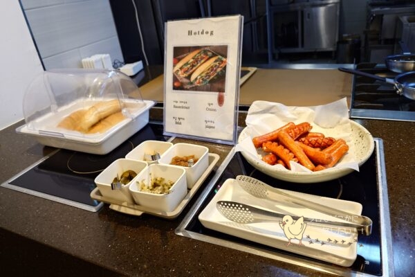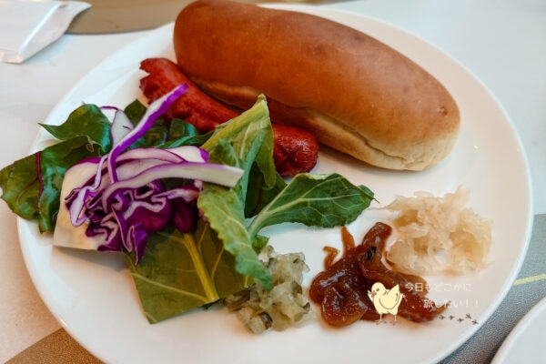 コッペパンはほんのり焼いて、ソーセージやオニオンやザワークラウト、サラダの刃物類などを具材に選んでみました。