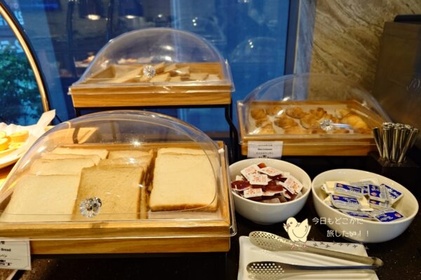 種類は少な目。パンは食パンやミニクロワッサンに、ジャムやバターがありました。