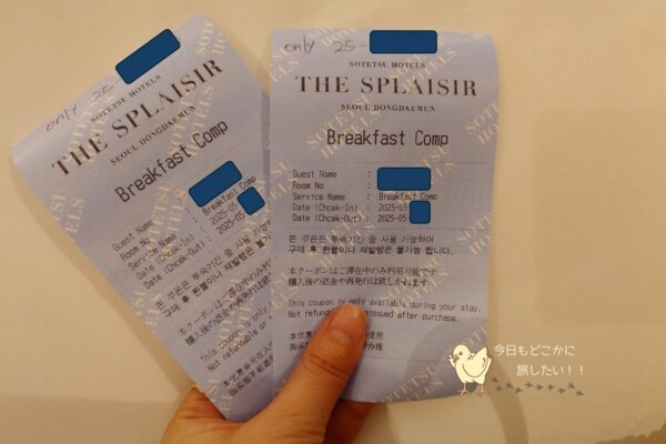 が、チェックイン時にスタッフさんから、「イベントをやっていて、明日の朝食券をプレゼントしてます」と、思いがけず、ホテルで朝食をいただけることになりました。