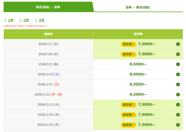 今回だと、羽田→宮崎路線だと、運賃設定なし日はなしになっています。