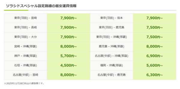 ソラシドスペシャルセールは11月28日~12月4日23:59まで。1月~3月上旬の搭乗分がセール。羽田ー九州・沖縄7,500円~