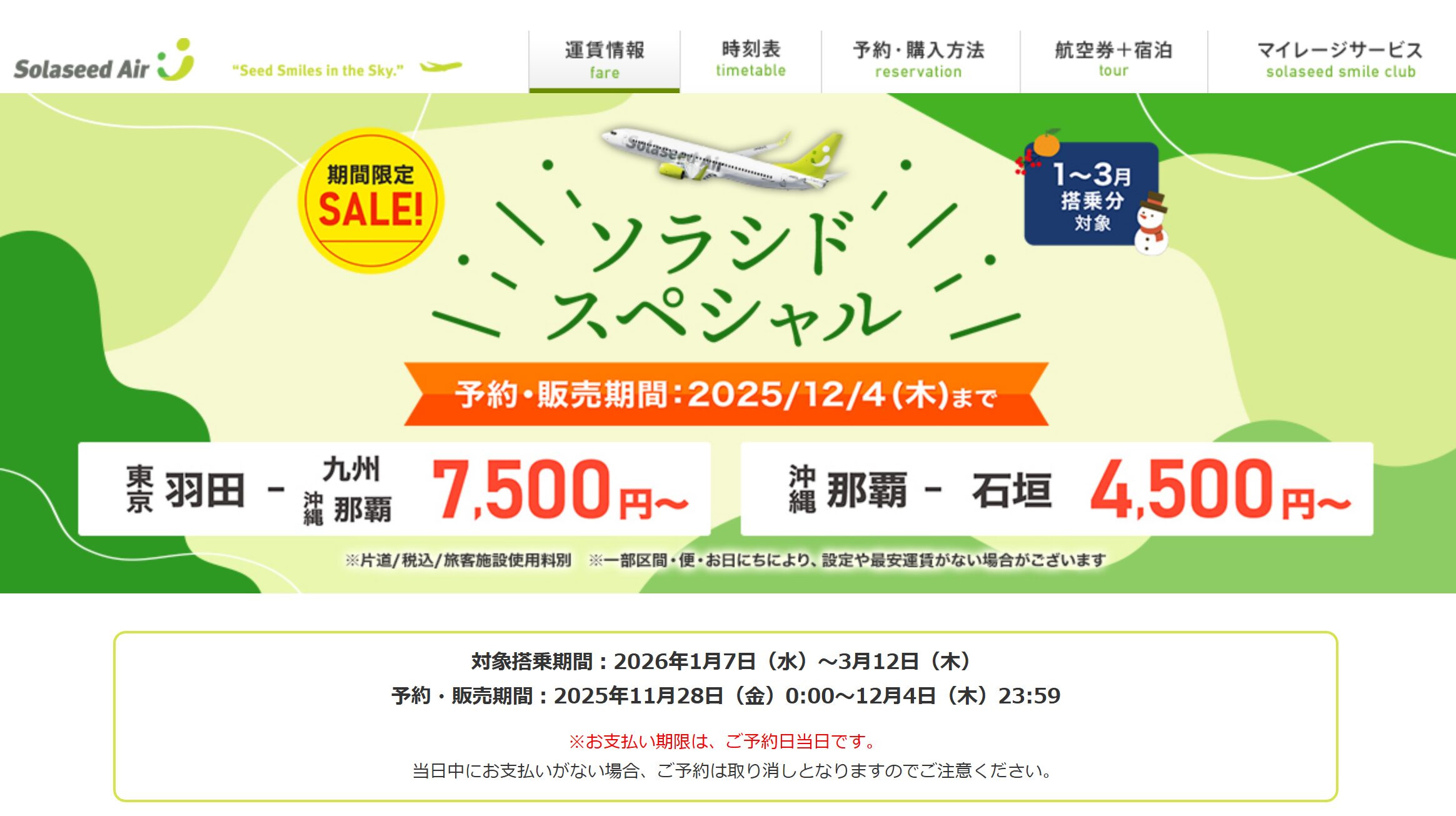 ソラシドスペシャルセールは11月28日~12月4日23:59まで。1月~3月中旬の搭乗分がセール。 | 今日もどこかに旅したい