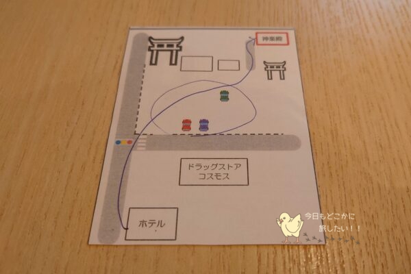 ホテルで夜神楽に行く前にいただいたアクセスマップなのですが、青いボールペンのルートがスロープになっていると教えてくれました。
