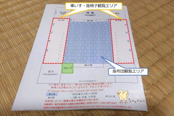 夜神楽は基本的には畳に座って見学となるのですが、車いすや足の悪い方向けの椅子でも見える板の間の観覧席も用意されています。